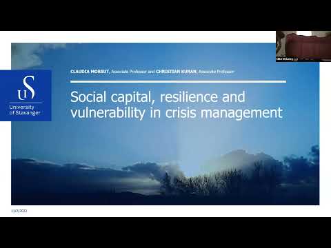 In this webinar, Associate Professors Claudia Morsut and Christian Henrik Alexander Kuran discuss the role of social capital in crisis management and its linkages with resilience, vulnerability and risk awareness. Using findings from the Horizon 2020 research project BuildERS (Building European Communities’ Resilience and Social Capital https://buildersproject.eu/), the two presenters illustrate which kind of relationships social capital establishes with resilience, vulnerability and risk awareness when individuals and local communities cope with a crisis or a disaster. They will provide concrete suggestions to address challenges in crisis management to strengthen social capital.